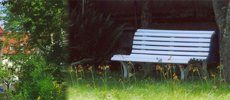 Sie liegt im Dachgeschoß eines Wohnhauses mit Blick auf den Garten.